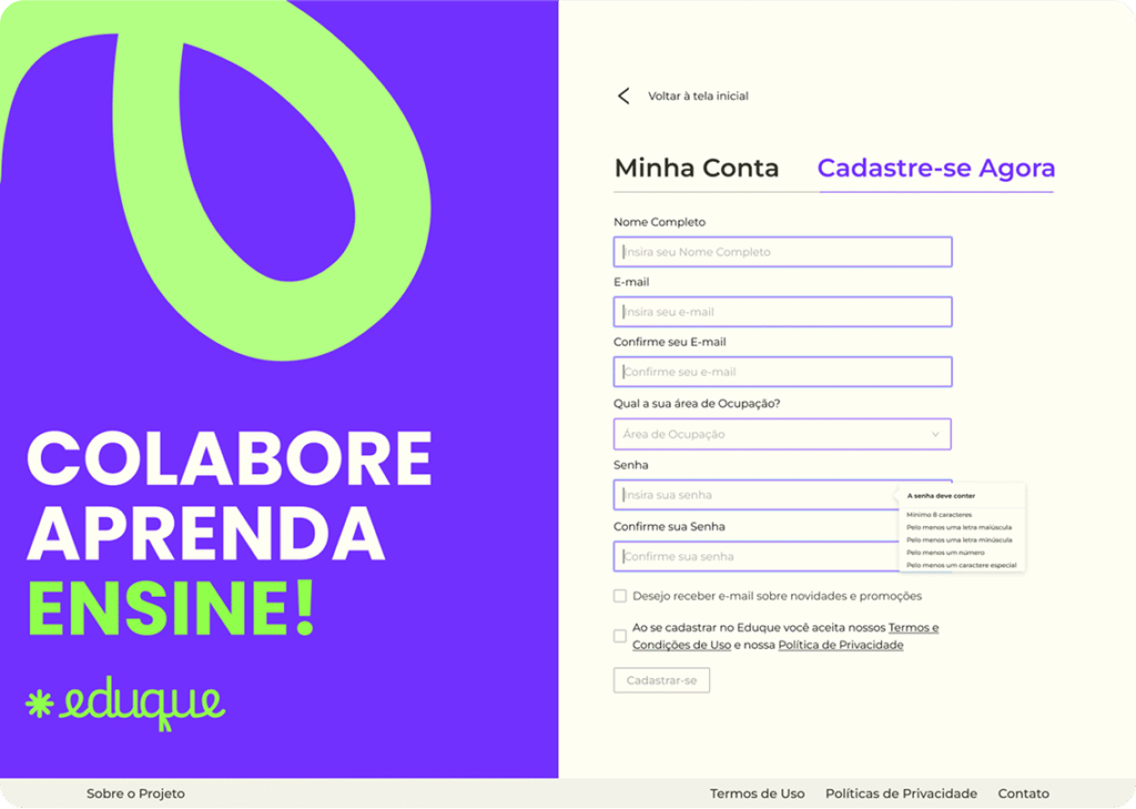 Além disso, as cores primárias vibrantes dão vida à experiência, enquanto as cores neutras garantem clareza e equilíbrio. O nome “Eduque” reflete diretamente essa missão de apoiar a educação.